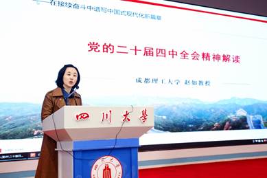11月14日,物理学院在望江校区东三教演播厅成功开展党的二十届四中全会精神解读专题学习会。学习会特邀成都理工大学赵如教授担任主讲,深度解读了“十四五”时期的建设成果与“十五五”时期的战略规划。辅导员吴海英老师主持本次学习会,学院2024级全体研究生同学及部分研究生党支部共同参加了此次学习。