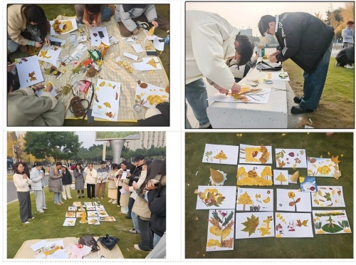 活动正式开始后,同学们纷纷步入铺满金色银杏叶的校园,俯身采集银杏叶、枫叶、松果等自然素材。大家或以小组为单位,或独自沉浸其中,用巧思将落叶转化为艺术作品。现场彩叶铺地、笑声盈耳,共同构筑起"自然与艺术"交融的创作空间。