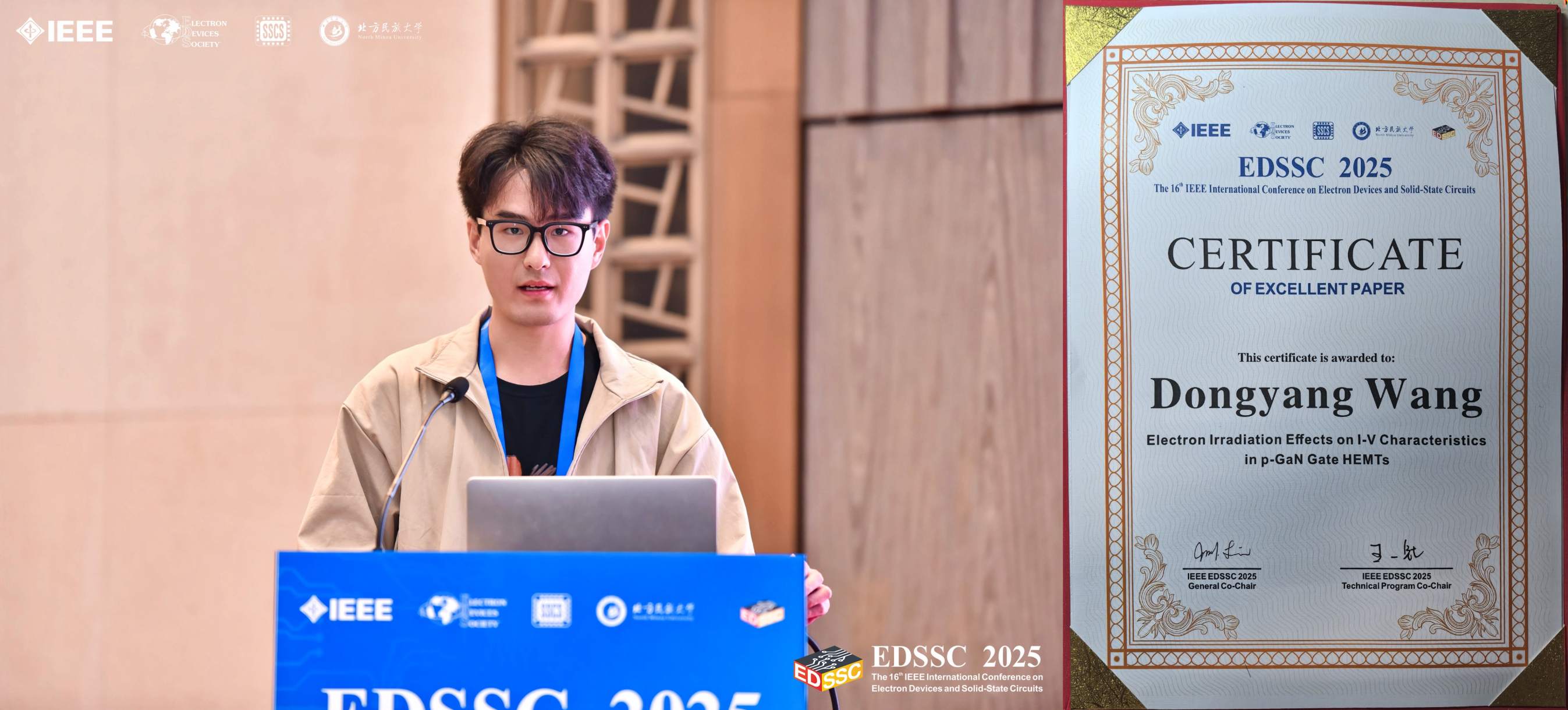 爱游戏ayx官网平台微电子教学研究中心的微电子抗辐照与可靠性团队硕士研究生王冬阳、陈鹏伟、郭睆实和邱爱霖均以第一作者发表论文并作了口头报告,其中论文的研究领域为功率半导体器件。王冬阳同学的论文《Electron Irradiation Effects on I-V Characteristics in p-GaN Gate HEMTs》获评“Excellent Paper”(优秀论文)。本次EDSSC会议共设置12个分会场,产生了18篇优秀论文,其中功率半导体器件分会场产生了2篇优秀论文,该团队论文是其中之一。