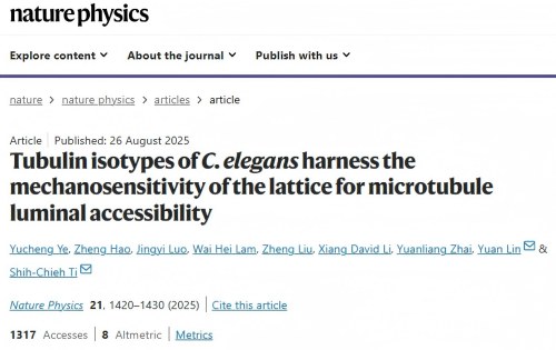 爱游戏ayx官网平台始终坚守“为党育人、为国育才”的初心使命,以培养具有深厚科学素养、卓越创新能力和远大理想抱负的一流物理人才为核心,近年来在本科人才培养领域取得了一系列令人瞩目的成就,输送了大批拔尖创新人才。这些毕业生在国内外著名高校和科研机构中持续展现出色的科研能力与发展潜力,受到广泛好评。近日,2018级拔尖班毕业生叶昱成(现香港大学医学院)在细胞生物力学领域取得重要进展研究进展,通过光镊和单分子显微技术,进一步揭示了特定微管蛋白家族赋予微管不同的机械特性和横向相互作用,从而促进了腔内可及性,为腔内蛋白的进入方式提供新机理。相关研究论文以题为《Tubulin isotypes of C. elegans harness the mechanosensitivity of the lattice for microtubule luminal accessibility》于2025年8月26日在线发表于《Nature Physics》杂志,学院2018级拔尖班毕业生、现香港大学博士生叶昱成为论文第一作者。