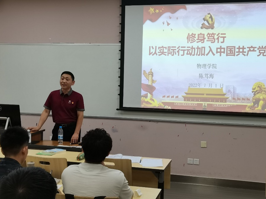 2022年7月1日上午10点,在建党节来临之际,学院党委副书记陈笃海为物理学院2020级本科生讲授了“修身笃行——以实际行动加入中国共产党”主题党课。此次活动在江安第一教学楼A103教室开展,辅导员谭立洁老师主持,2020级全体预备党员和入党积极分子参加。此次党课中陈笃海副书记生动形象地为同学们阐述了端正入党动机的重要性以及如何以实际行动加入中国共产党,参加此次党课学习的同学们受益匪浅。